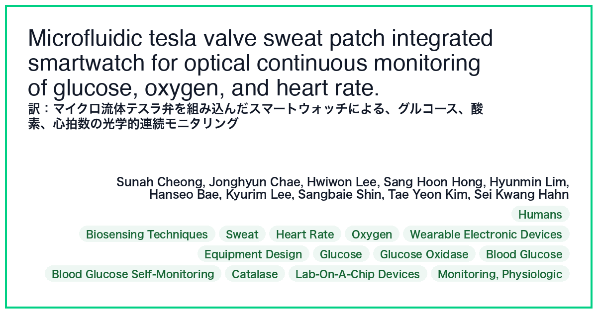 タイトル(原文) Microfluidic tesla valve sweat patch integrated smartwatch for optical continuous monitoring of glucose, oxygen, and heart rate.