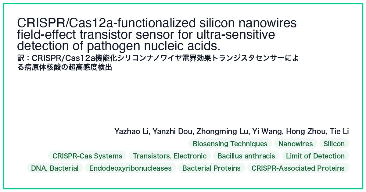 | タイトル(原文) | CRISPR/Cas12a-functionalized silicon nanowires field-effect transistor sensor for ultra-sensitive detection of pathogen nucleic acids. |