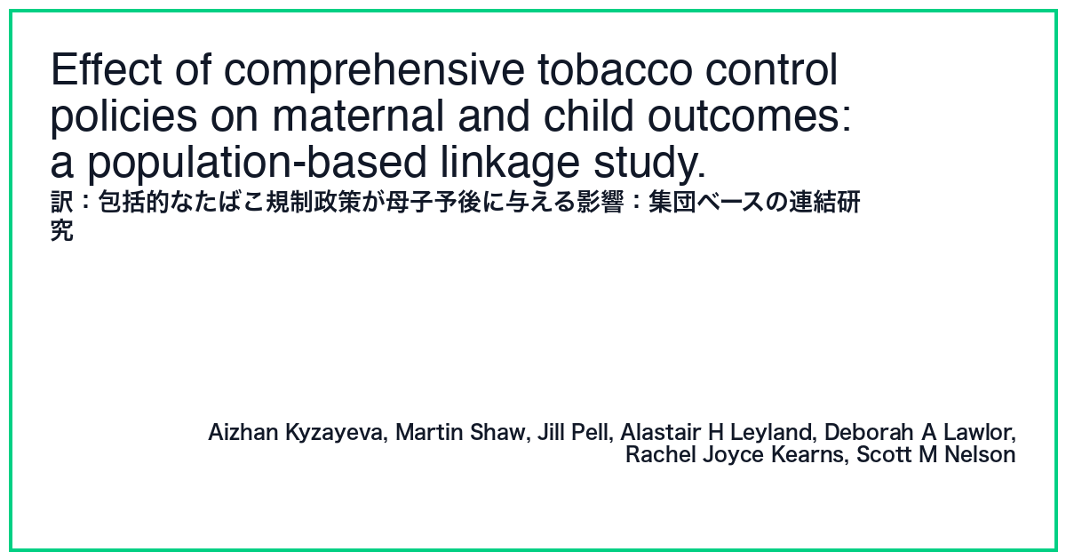 | タイトル(原文) | Effect of comprehensive tobacco control policies on maternal and child outcomes: a population-based linkage study. |