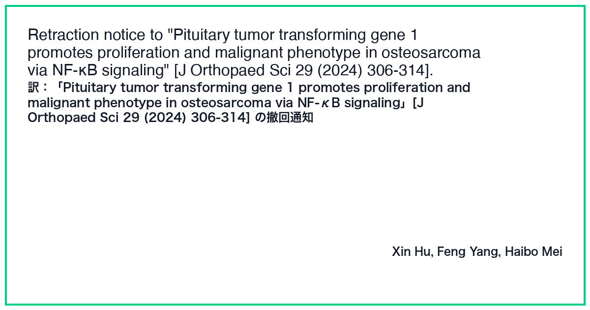 | タイトル(日本語) | 「Pituitary tumor transforming gene 1 promotes proliferation and malignant phenotype in osteosarcoma via NF-κB signaling」[J Orthopaed Sci 29 (2024) 306-314] の撤回通知 |