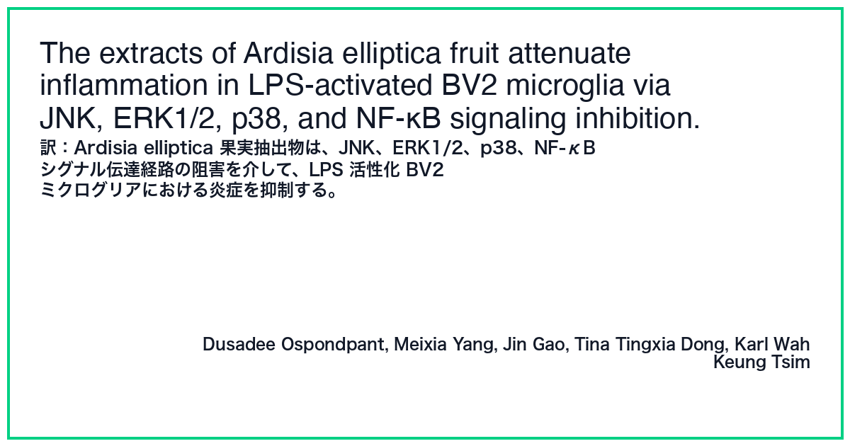 | タイトル(原文) | The extracts of Ardisia elliptica fruit attenuate inflammation in LPS-activated BV2 microglia via JNK, ERK1/2, p38, and NF-κB signaling inhibition. |