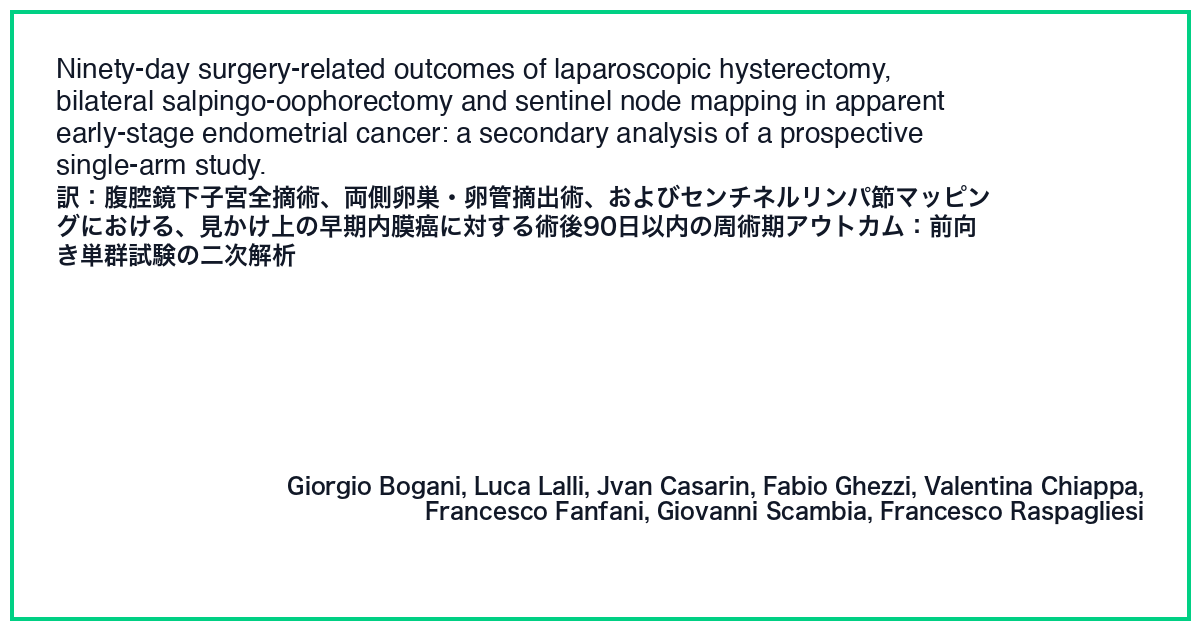 タイトル(原文) Ninety-day surgery-related outcomes of laparoscopic hysterectomy, bilateral salpingo-oophorectomy and sentinel node mapping in apparent early-stage endometrial cancer: a secondary analysis of a prospective single-arm study.