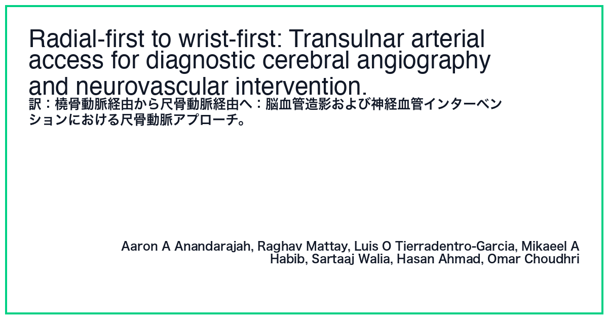 | タイトル(原文) | Radial-first to wrist-first: Transulnar arterial access for diagnostic cerebral angiography and neurovascular intervention. |