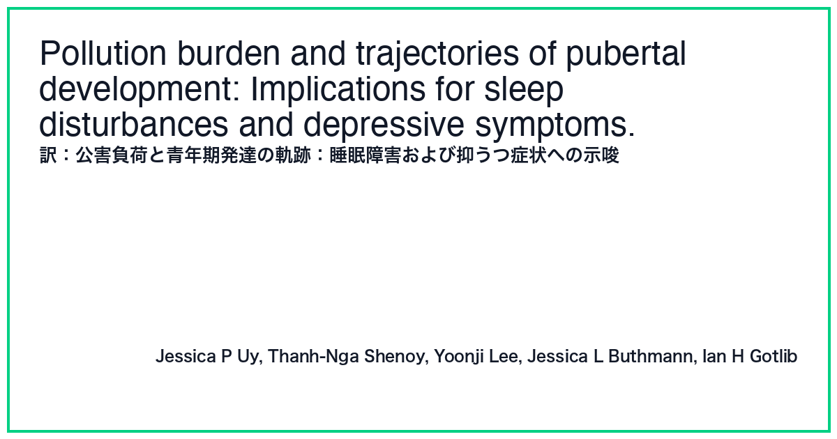 | タイトル(原文) | Pollution burden and trajectories of pubertal development: Implications for sleep disturbances and depressive symptoms. |