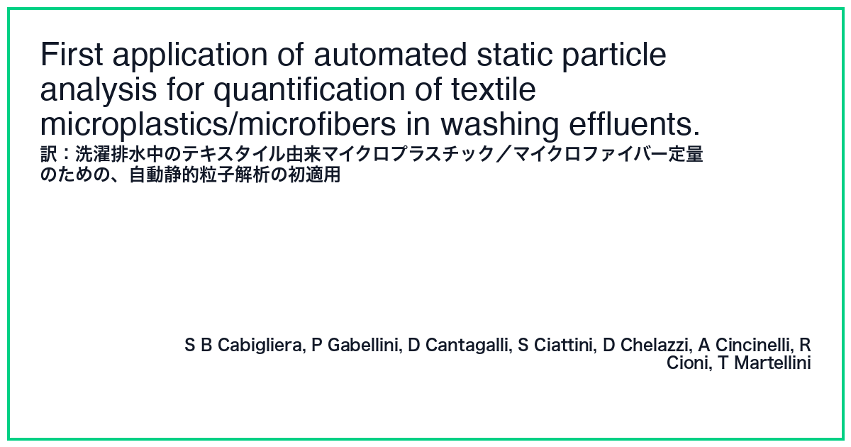 | タイトル(原文) | First application of automated static particle analysis for quantification of textile microplastics/microfibers in washing effluents. |